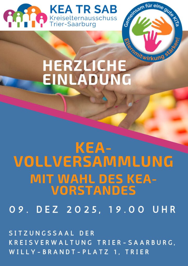 Am 09.12.2025 um 19:00 Uhr findet die nächste KEA-Vollversammlung im Sitzungssaal der Kreisverwaltung Trier-Saarburg, Willy-Brandt-Platz 1 in 54290 Trier statt.
